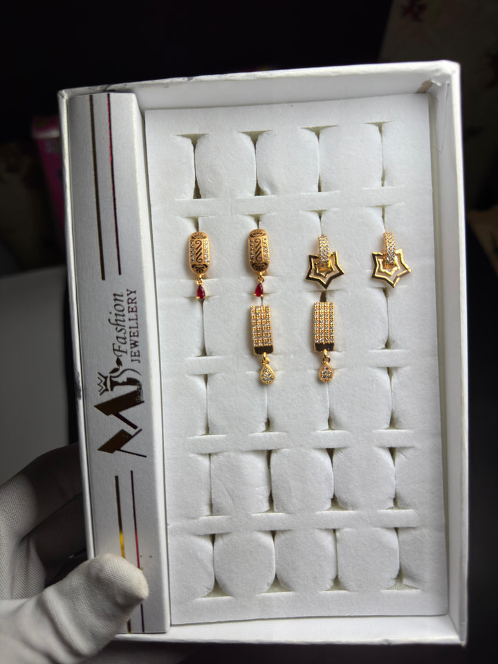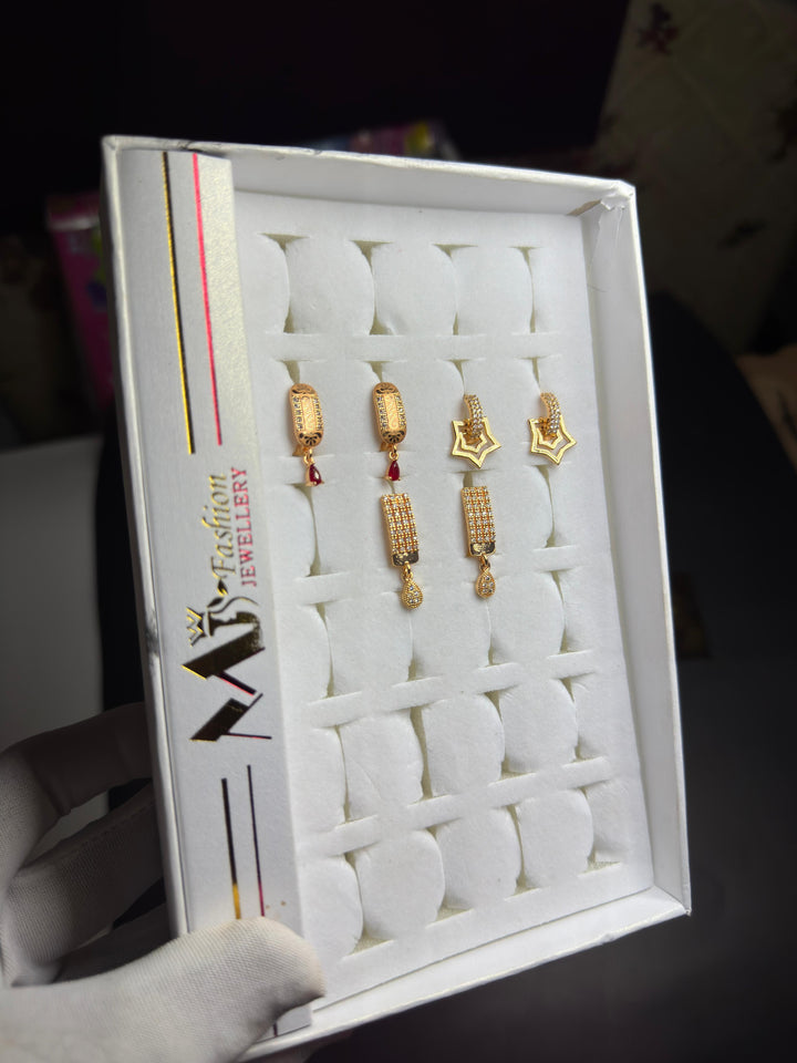Get 3 stunning styles in one set! This exclusive earrings combo includes star hoops, red stone dangles, and elegant square drop earrings, all crafted from high-quality stainless steel with 18K gold plating. Designed to be hypoallergenic, tarnish-free, and long-lasting, this set is perfect for daily wear, parties, weddings, or gifting.