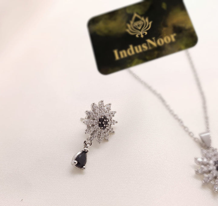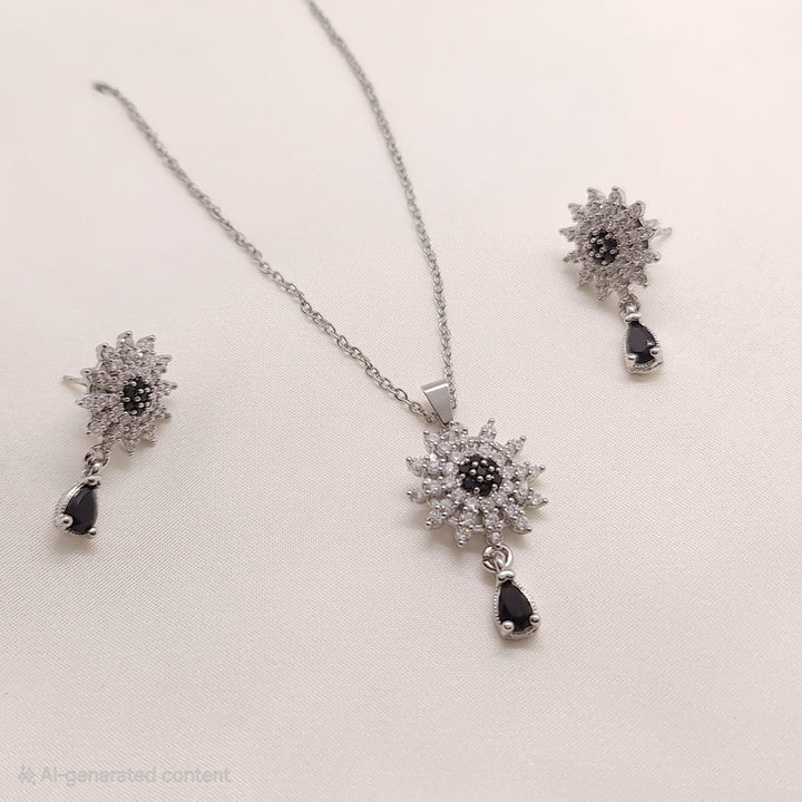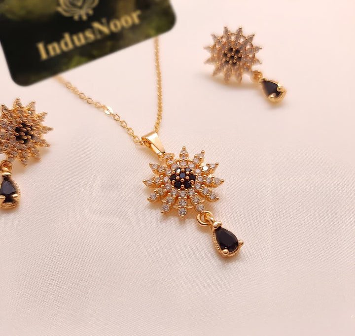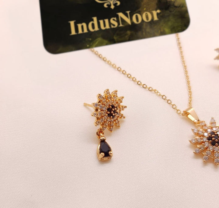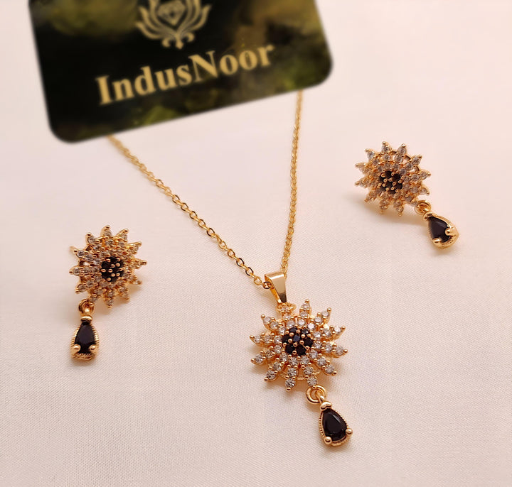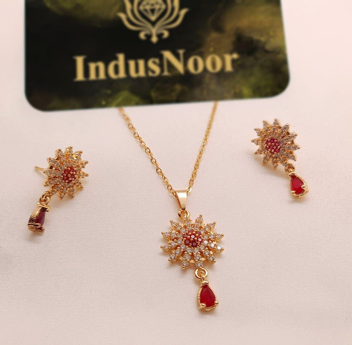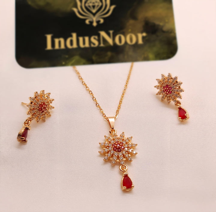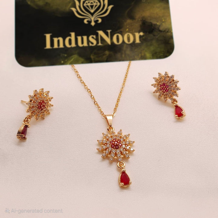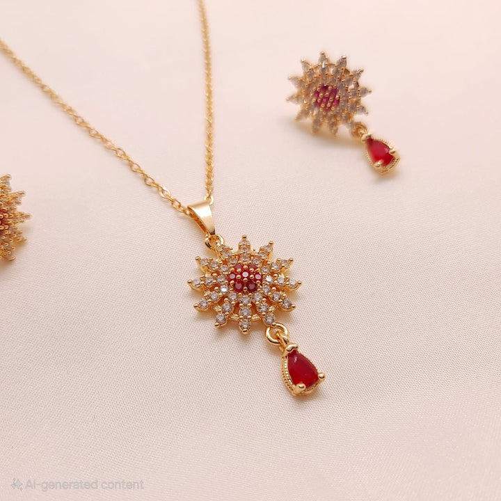 A sunflower-themed locket with a ruby-colored stone and a matching chain.